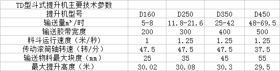本提升機為離心式或混合方式卸料,掏取式裝料,適用輸送堆積密度不大于1.5噸/米3的粉狀、粒狀、小塊狀的低磨琢性物料,物料的溫度不得超過60度。